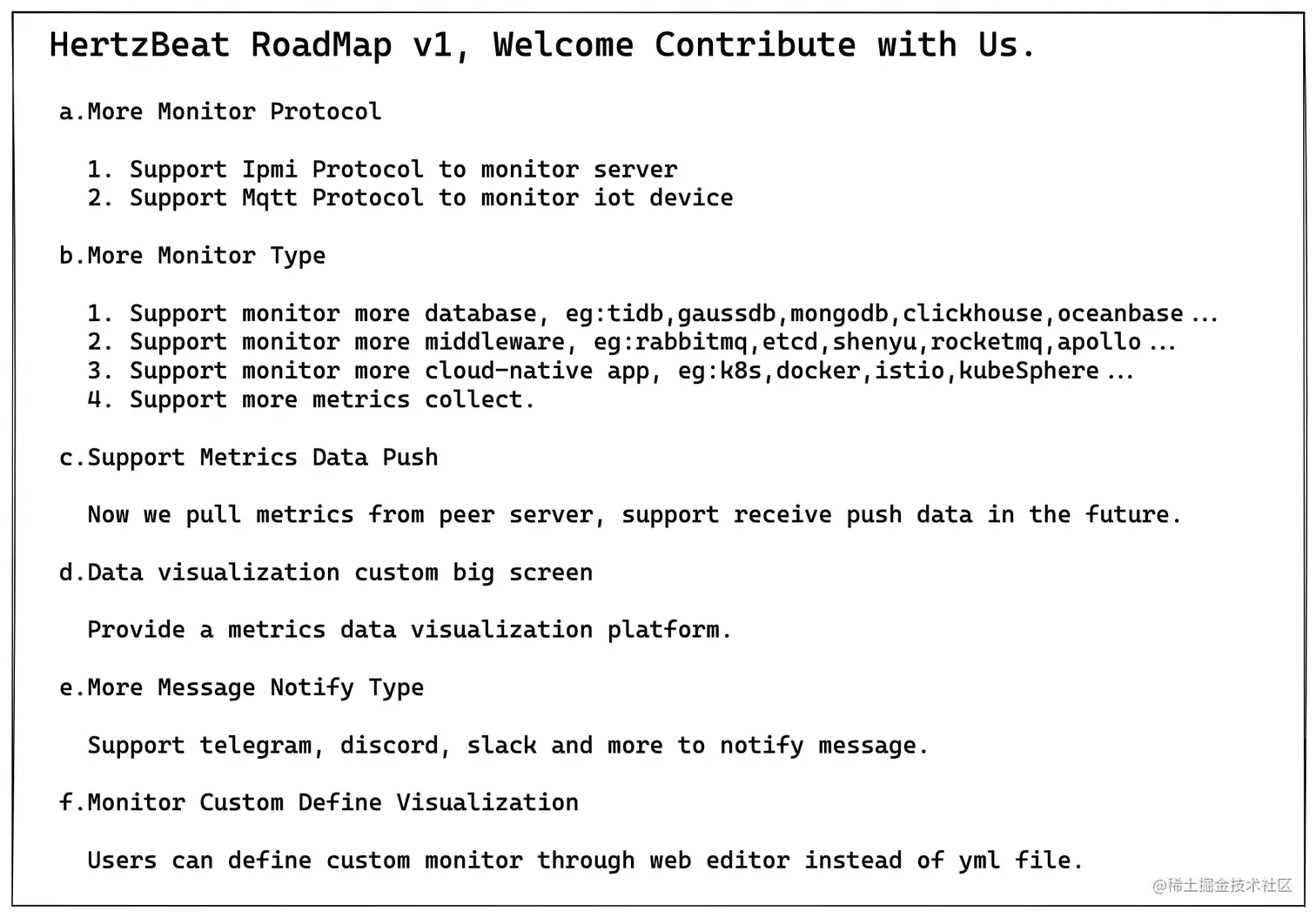 我们急需对测试用例,新增应用监控,文档等各方面的贡献者,非常欢迎您的加入。快来吧,HertzBeat 上手非常简单!