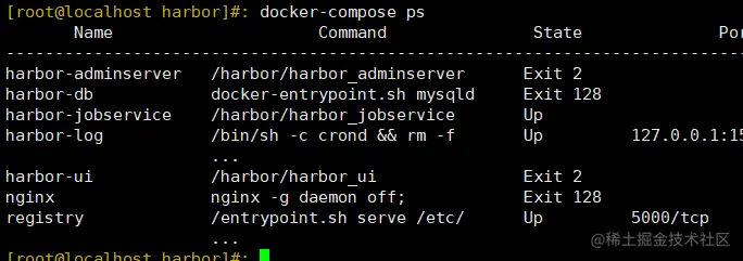 总共分为7个容器运行,通过在docker-compose.yml所在目录中执行 docker-compose ps 命令来查看, 名称分别为:nginx、harbor-jobservice、harbor-ui、harbor-db、harbor-adminserver、registry、harbor-log。