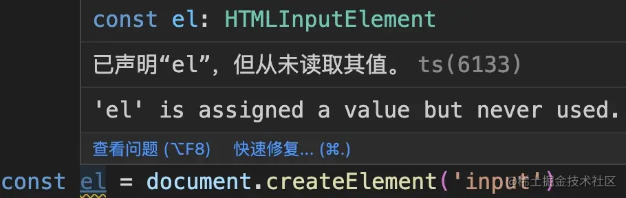 但如果这个DOM元素有点不一样,比如是个 input元素,那么 el.value 就该是个 string,如果用 HTMLElement 是会报错的,因为 HTMLElement上没有 value属性,需要用更精确的类型 HTMLElement,如果对于有些元素你实在是不知道其准确类型到底怎么拼写,可以让 ts告诉你