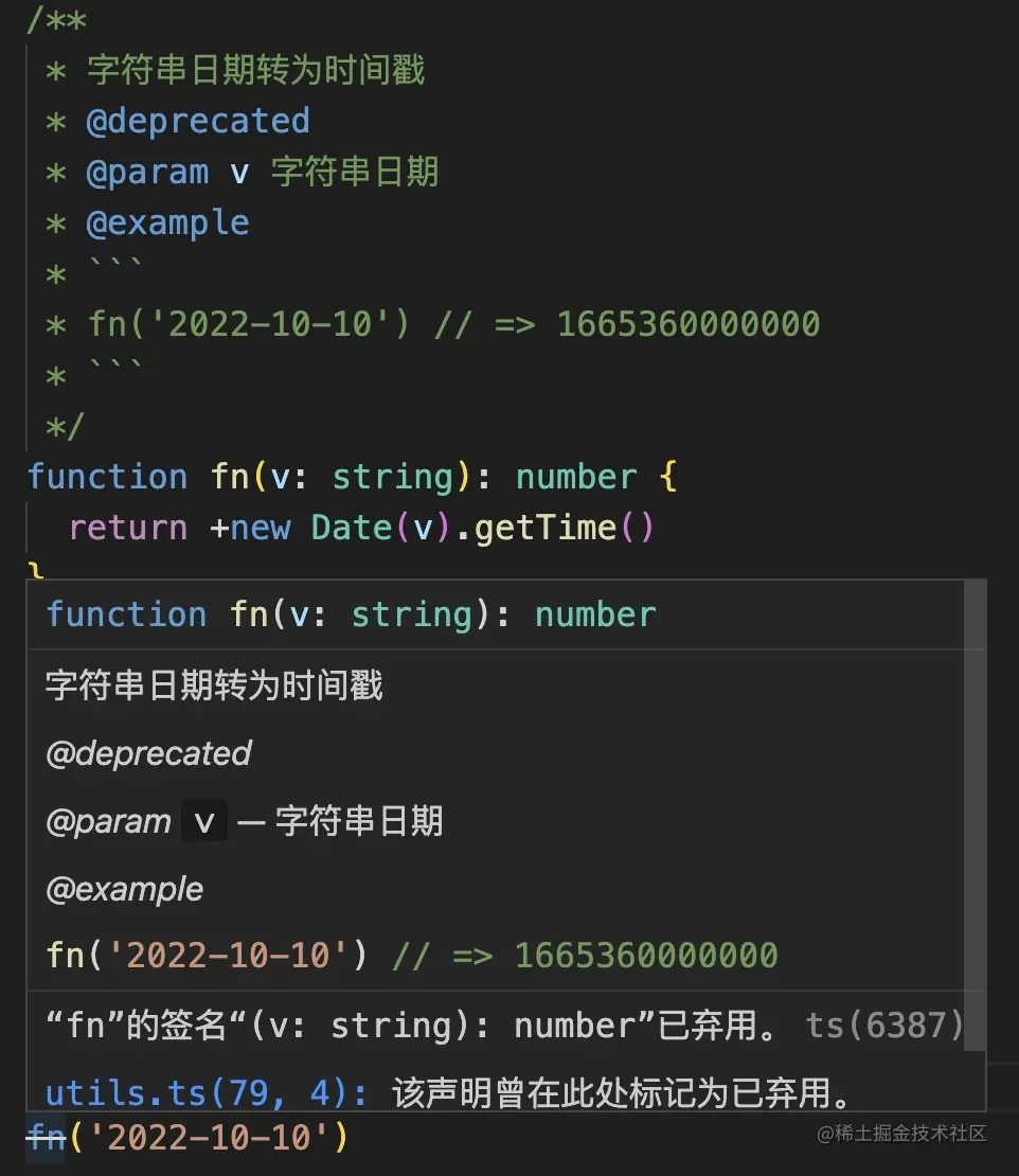 当有不知情的人继续调用这个被废弃的方法时,现代编辑器(例如 vscode)会自动给这个函数划个中划线,ts也会提示此方法已弃用