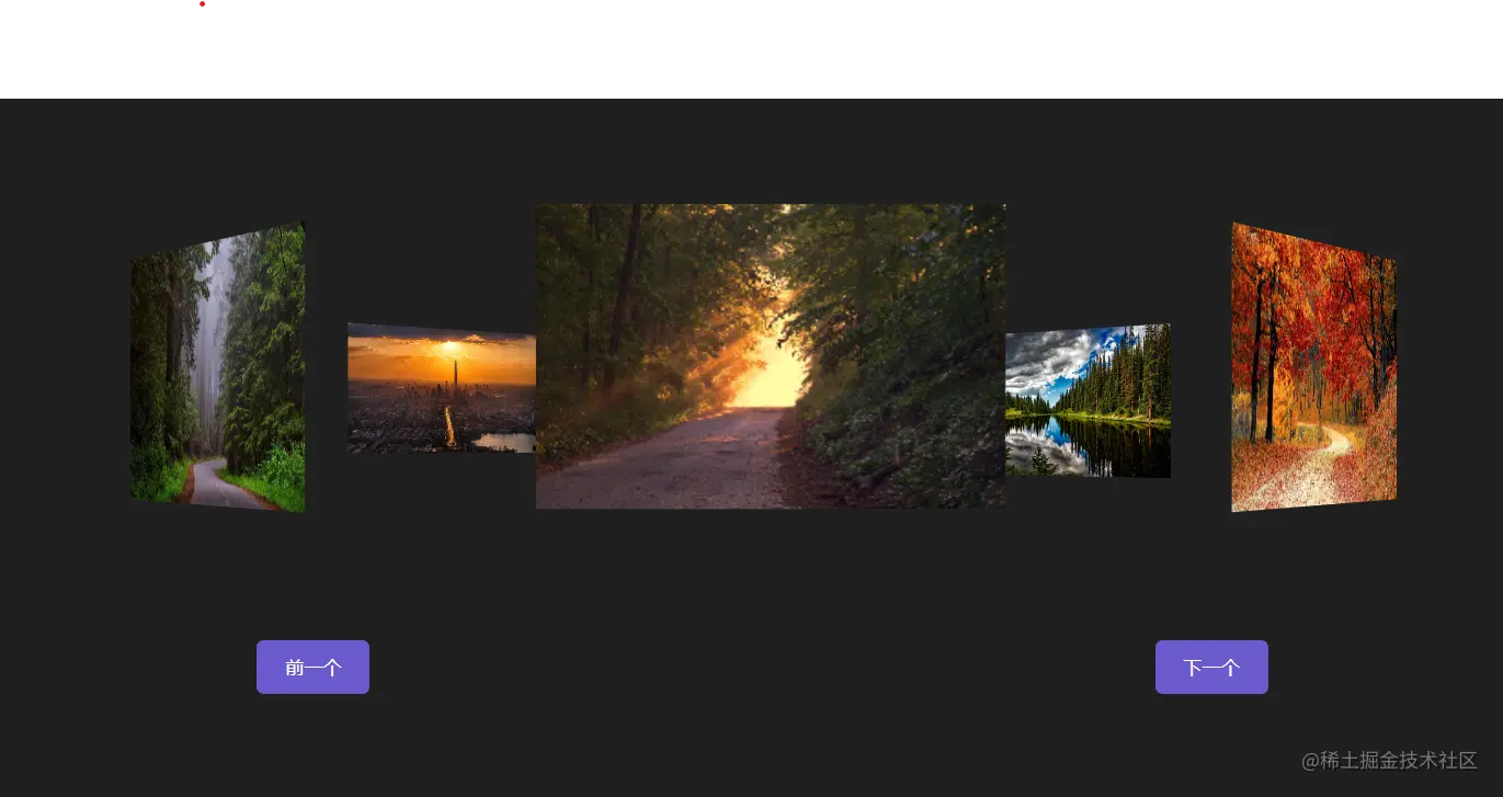 然后我们来编写核心的JavaScript代码,通过querySelector和getElementById获取HTML元素的信息;设置前一个按钮的点击事件,设置图片展示角度,点击按钮时停止自动转换,展示图片;编写下一个按钮的事件函数,设置图片展示角度,点击按钮时停止自动转换,展示图片;编写更新图片回廊的函数,设置图片3d转换属性值,设置图片每个3秒自动轮换。