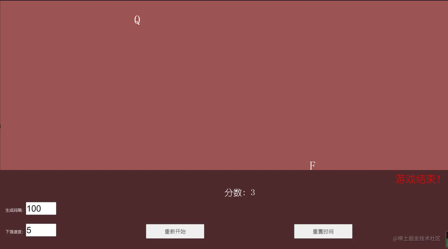 根据屏幕上随机出现的字母来点击键盘上对应的按键,可自行调节字母下落的速度以及时间间隔,还会有分数统计。