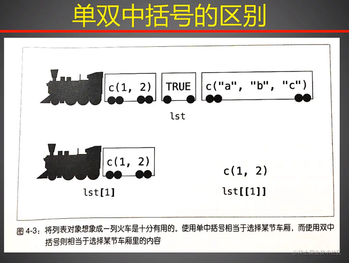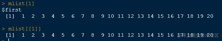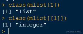 两者的差别在于,一个中括号其实输出的是列表的一个子集,它其实还是一个列表,因为如果一个访问多个元素,这些元素的数据类型又不同,那么输出结果只能是列表,当我们使用两个中括号进行输出,那么就是输出数据本身的类型,可以使用class()函数来测试一下