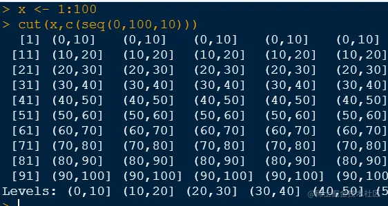R中有一个cut()函数,可以将连续型变量x分割成连续水平的因子: