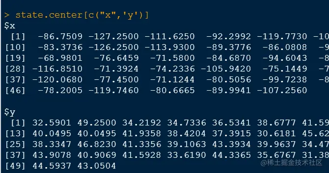 State.center就是一个典型的列表,是美国每个周的经纬度,可以使用list()函数来创建列表: