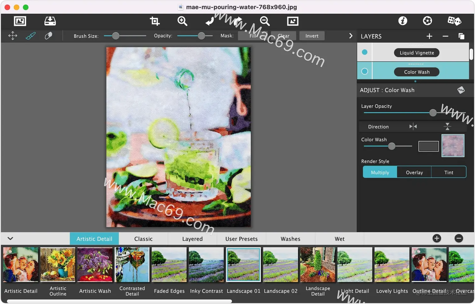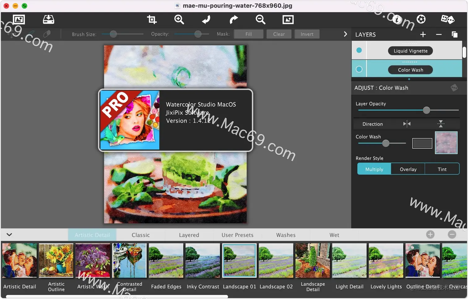 Jixipix Watercolor Studio Mac版是一款由jixipix推出的水彩画绘制工具,Jixipix Watercolor Studio特别版可以创建流体,液态,半透明的水彩画与自然流动的油漆。你只需将要转换的图片导入Jixipix Watercolor Studio for Mac 特别版中,便会立即生成水彩,然后使用一系列滑块,图层,画笔,颜色洗涤和艺术表面来自定义你的绘画,以求到达满意的效果。