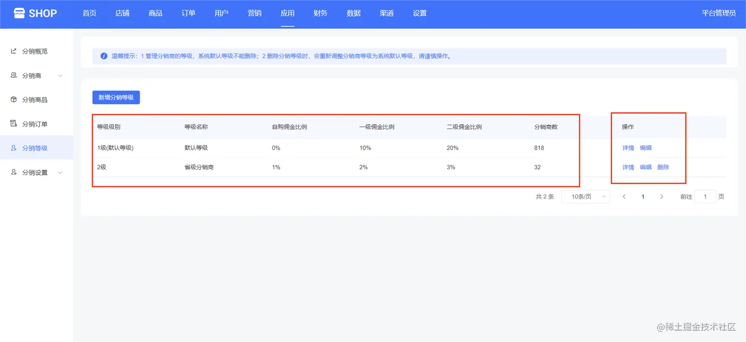 下面可以看到等级级别、等级名称、自购佣金比例、一级佣金比例、二级佣金比例、分销商数等,还可以进行详情、编辑、删除等操作,如下图所示: