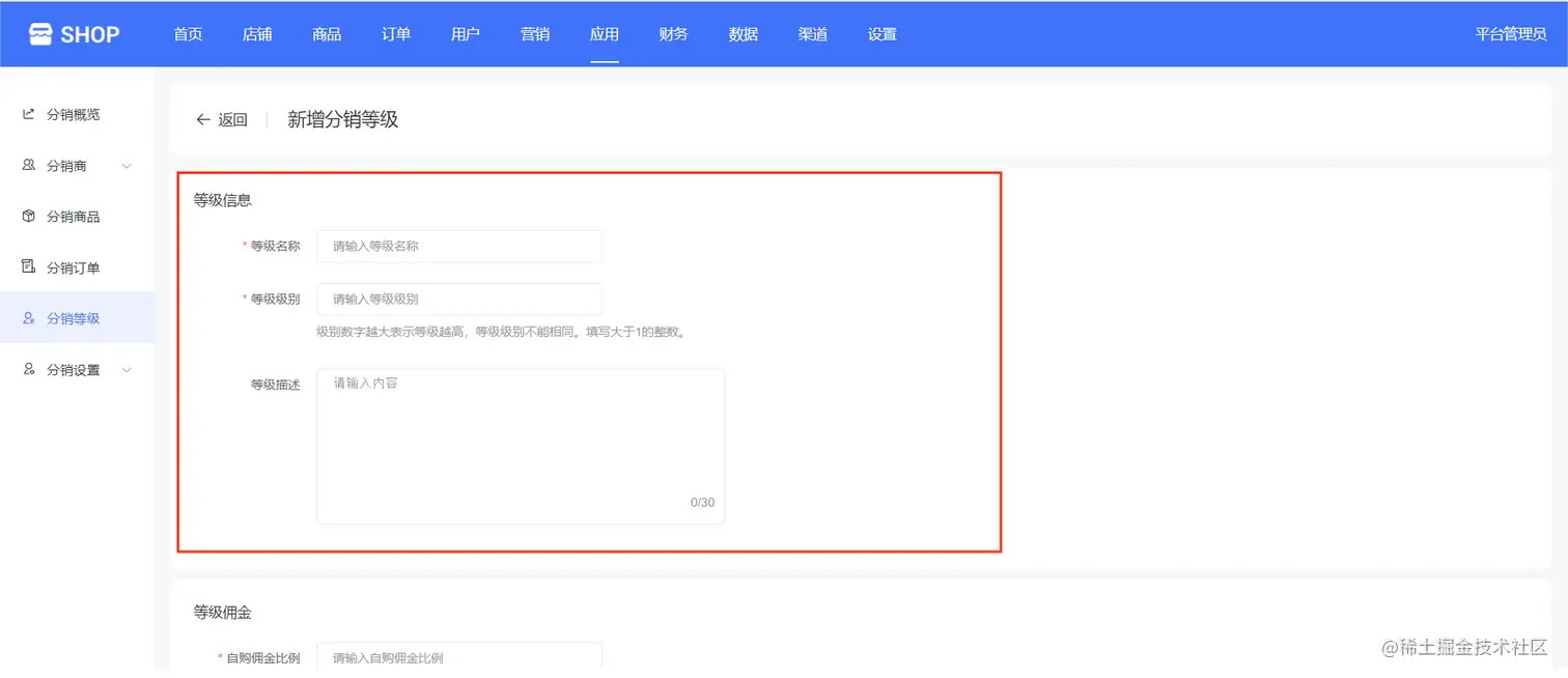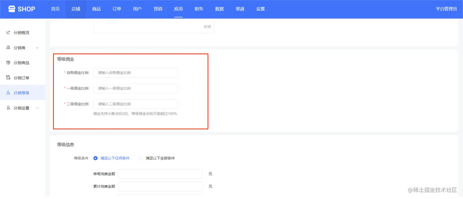 输入自购佣金比例、输入一级佣金比例、二级佣金比例等等级佣金,如下图所示: