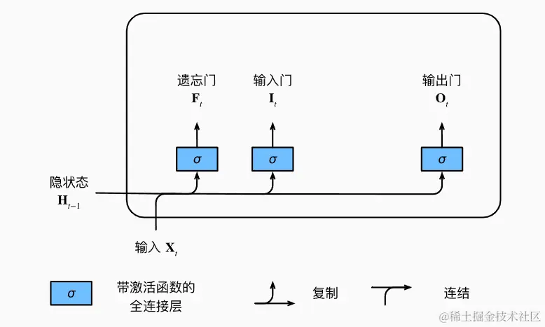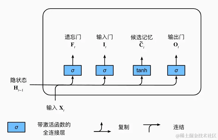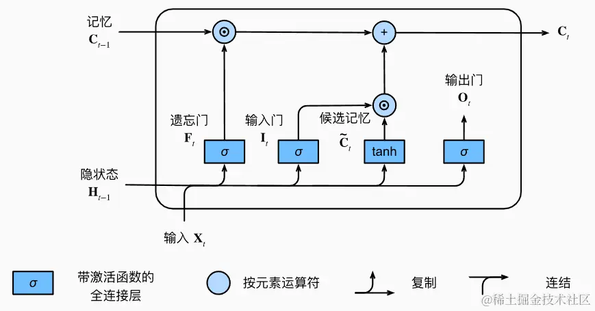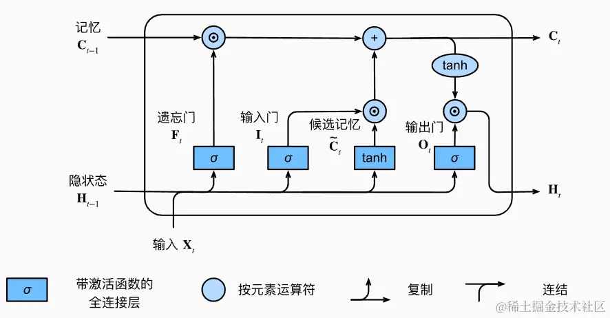 这三个门的计算方式与GRU相同,不同的是,LSTM引入了一个候选记忆单元(Candidate Memory Cell)
