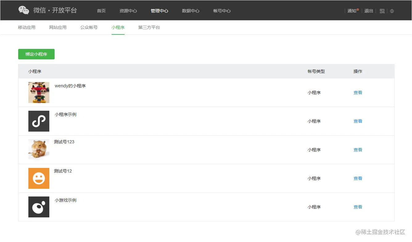 登录微信开放平台 — 管理中心 — 小程序 — 绑定小程序