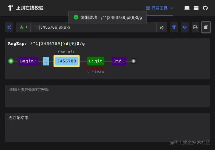 最后来一个复制的小功能,就是开头我们说的,正则存在时,第一行最右边要显示一个 copy 按钮,用来把当前正则复制到剪切板。