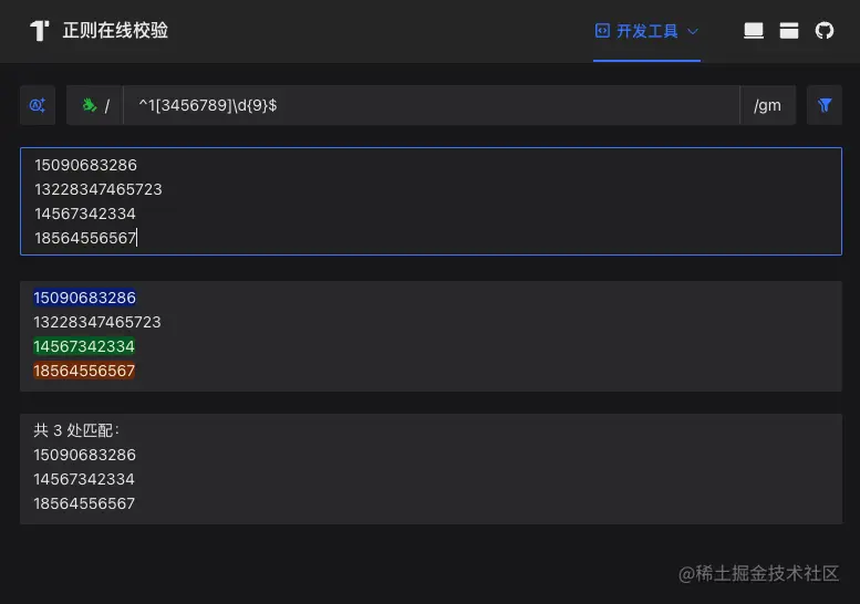 第三排输入框是待匹配字符串,输入一些字符串用来做正则匹配检测的。