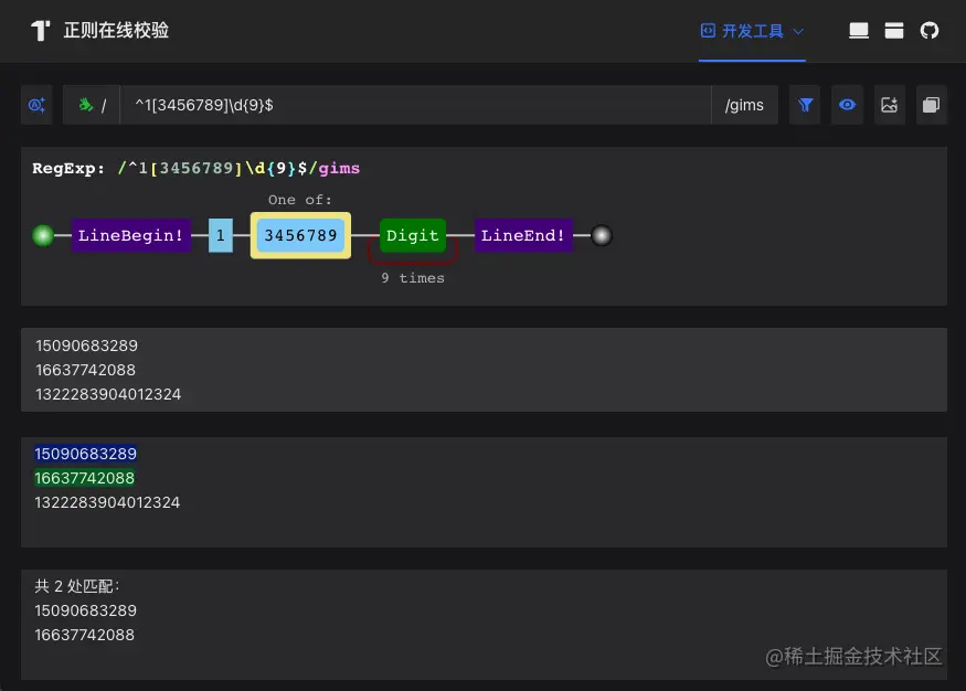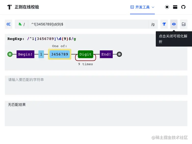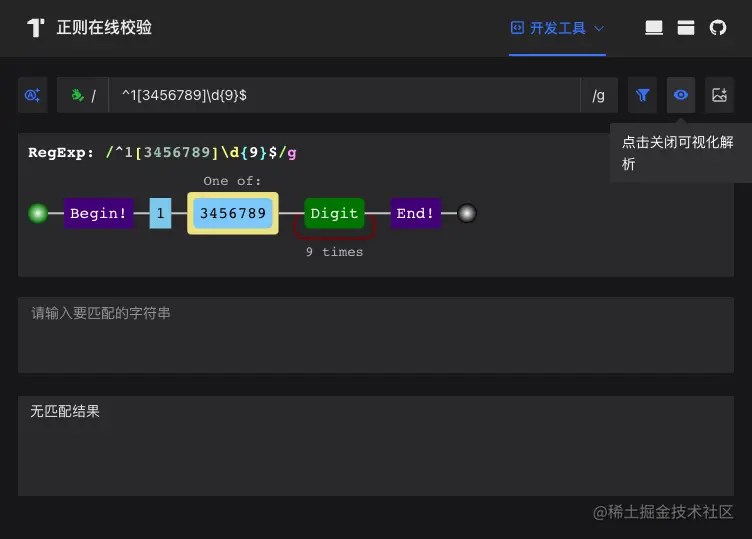 再往右小眼睛图标是可视化预览,开启之后我们输入正则就会自动渲染图中第二排那个图形化正则匹配步骤,只有可视化正则步骤开启并且正则表达式无误才会有第一排最右边倒数第二个即图片下载按钮,用来下载正则可视化 png 图。