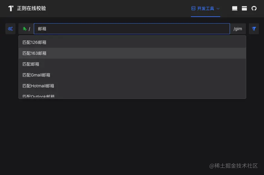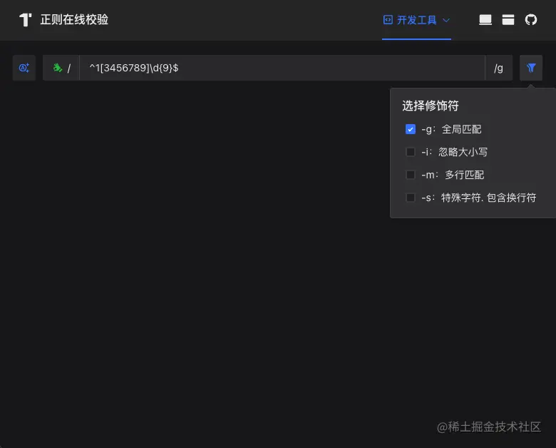 输入框右边漏斗图标是修饰符筛选项,就是选择正则匹配的一些修饰符(g、i、m、s)。