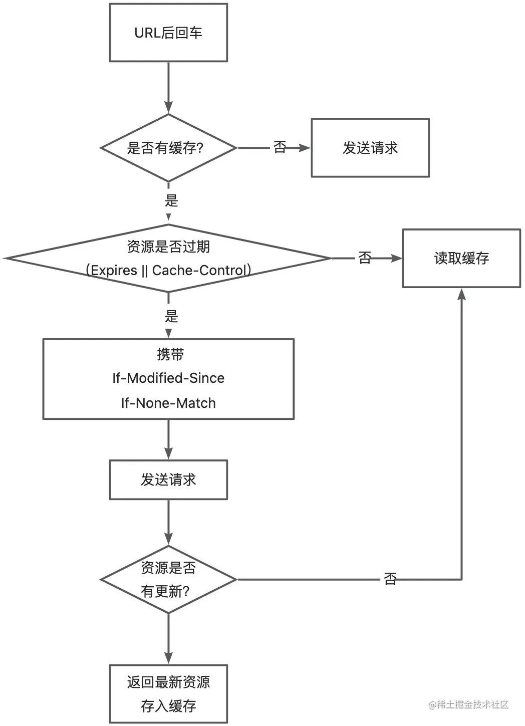 这张图其实画的有点多,但是主要是想让大家了解在获取资源之前,其实是有一个缓存的判断的,否则就不会发送对应的请求