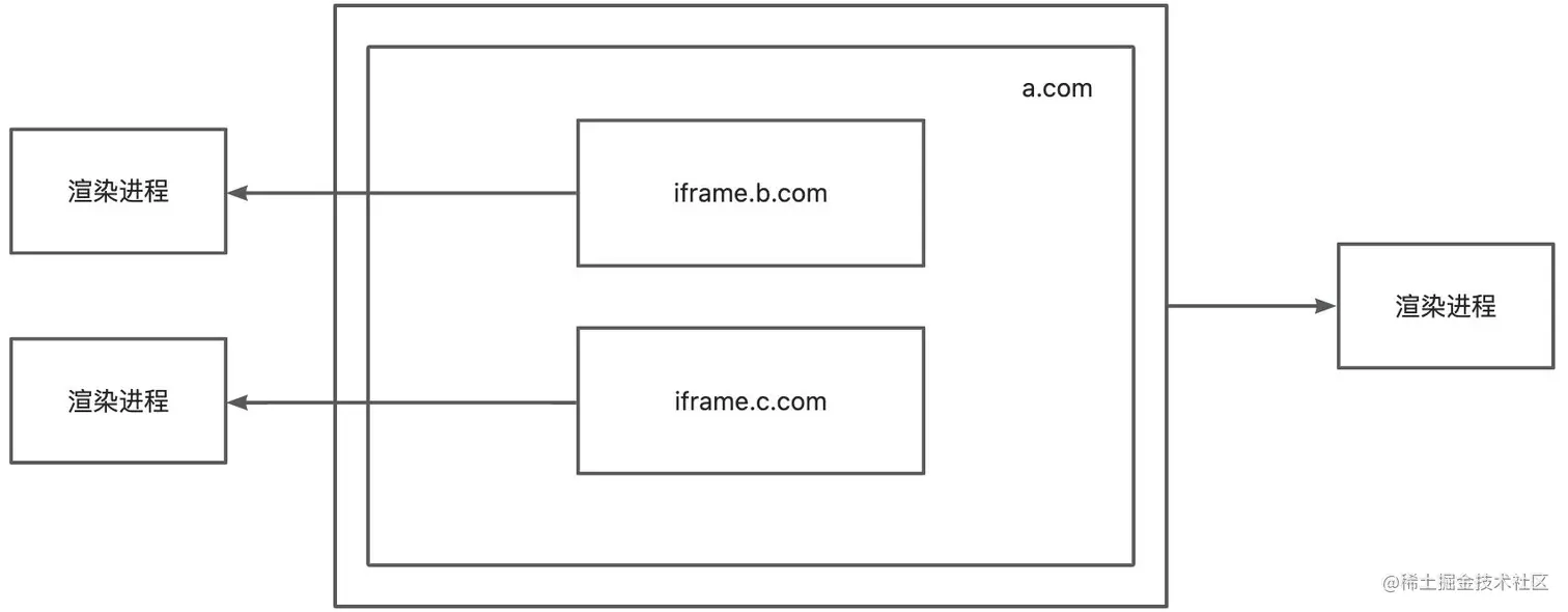 前面说我们每个标签页一个进程,但是这个标签页当中有可能通过iframe嵌入了另一个页面,这个时候如果公用一个进程的话可能就会带来风险。所以谷歌浏览器为跨站点的iframe页面也开启了一个单独的渲染进程。要考虑浏览器同源策略的影响,一个站点无法在未经允许的情况下访问其它站点的数据,进程隔离是分割站点的最有效的方式