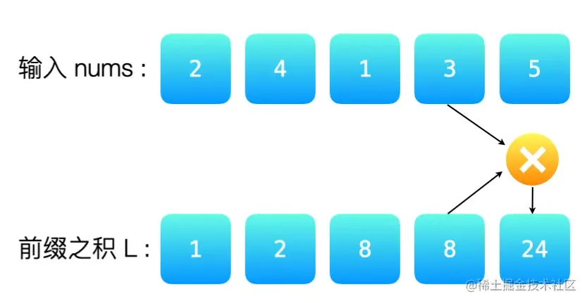 对于数组L,有L[i] = L[i - 1] * nums[i - 1]。如图: