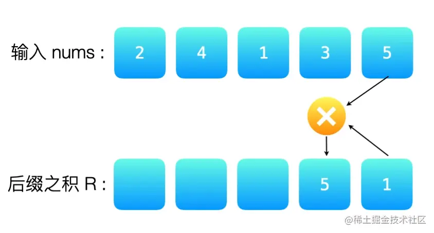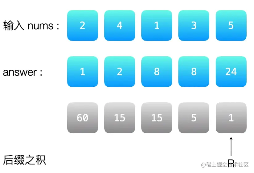 对于数组R,有R[i] = R[i + 1] * nums[i + 1]。如图: