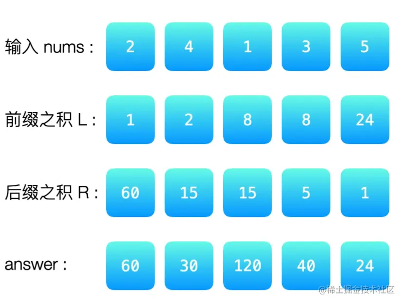 我们创建两个数组L和R分别用来存放前缀乘积和后缀乘积。其中L[0] = 1且R[0] = 1(上面讲的)。