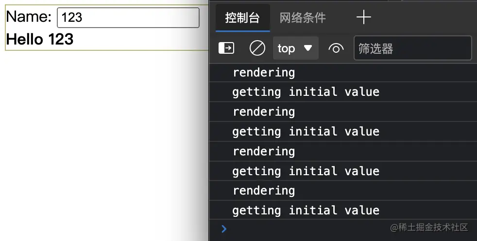 具体的操作很简单,只需要向useState传入一个返回初始化state的函数即可。应用到前面的示例就是将useState的初始化改为useState(getInitialNameValue)。改完后的效果如下图: