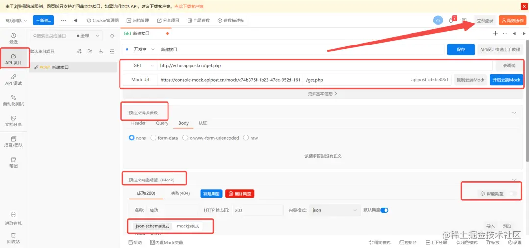 如果你是后端, 需要提前mock一份数据,与前端进行同步开发,在Apipost的API设计中可以预定义接口的请求参数和响应期望,开启智能mock更能省心。但是要分享mock的数据和设计好的文档,就需要登录才能使用了,不然没法保证分享的数据安全。而如果下载客户端,可以进行本地mock,获取本地信息可以在内网进行分享。