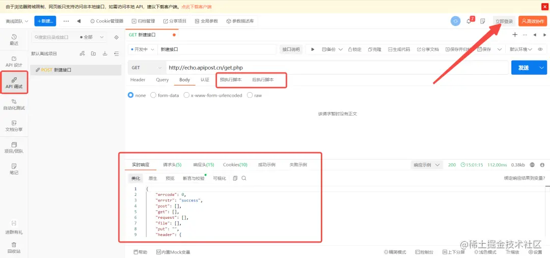 如果只是需要调试下开发的接口是否正确,同样可以直接进入web版调试,Apipost提供了预执行脚本、后执行脚本等大多数用户常用的需求,还可以自动成功/失败响应示例,可以直观的看出接口情况。