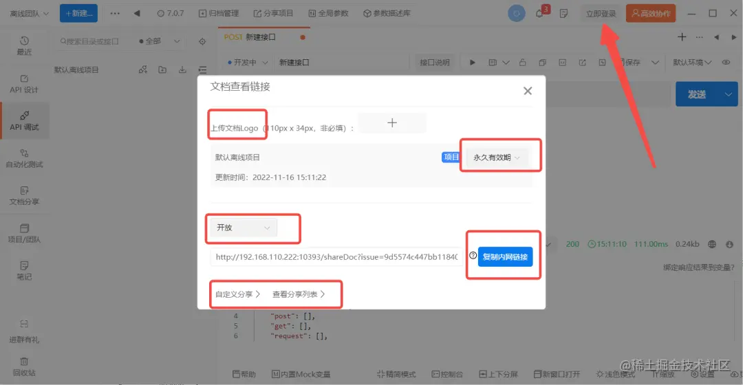 Apipost支持离线使用,以上所有常用功能都可以正常使用。断网数据也不会丢失,下次在同一设备进入工作台还会保留之前的数据;即使在登录之后,登录前操作的数据也会保存在离线项目中,保证数据不会丢失。而公司内网的情况也是很常见,在正常的功能都能用的前提下,还是建议下载客户端使用,Apipost客户端支持内网分享,其中包括了本地mock数据和给内网同事分享数据和文档,最大程度保证了在内网状态下不登录也能与同事共享数据。