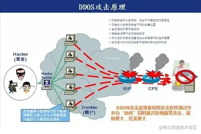 1、DDOS攻击: 又叫分布式拒绝服务攻击,是指处于不同位置的多个攻击者同时向一个或数个目标发动攻击,或者一个攻击者控制了位于不同位置的多台机器并利用这些机器对受害者同时实施攻击。由于攻击的发出点是分布在不同地方的,这类攻击称为分布式拒绝服务攻击,其中的攻击者可以有多个。一个完整的DDoS攻击体系由攻击者、主控端、代理端和攻击目标四部分组成。主控端和代理端分别用于控制和实际发起攻击,其中主控端只发布命令而不参与实际的攻击,代理端发出DDoS的实际攻击包。对于主控端和代理端的计算机,攻击者有控制权或者部分控制权。它在攻击过程中会利用各种手段隐藏自己不被别人发现。真正的攻击者一旦将攻击的命令传送到主控端,攻击者就可以关闭或离开网络。而由主控端将命令发布到各个代理主机上。这样攻击者可以逃避追踪。每一个攻击代理主机都会向目标主机发送大量的服务请求数据包,这些数据包经过伪装,无法识别它的来源,而且这些数据包所请求的服务往往要消耗大量的系统资源,造成目标主机无法为用户提供正常服务,甚至导致系统崩溃。简单来讲就是用多个客户端,不断像服务器发送大量的请求,超过他的处理能力,服务器处理不过来,就会拒绝后面的请求,达到让对方暂停服务的目的。