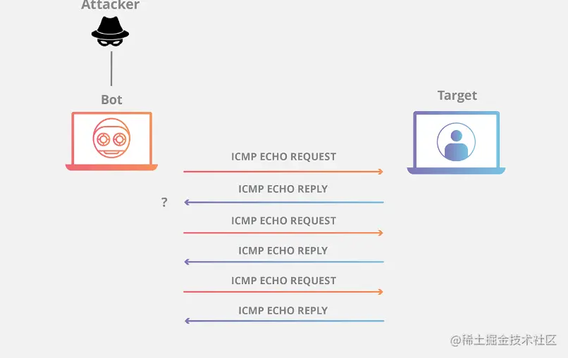 3、ICMP洪水攻击:网络控制消息协议(ICMP)是TCP/IP协议级当中核心之一,用于在网络中发送控制消息,提供可能发生在通信环境中的各种问题反馈。 因特网组管理协议(IGMP)是用于管理因特网协议多播组成员的一种通信协议。攻击者使用受控主机向目标发送大量的ICMP或IGMP报文,进行洪水攻击以消耗目标的网络带宽资源。在早期使用cmd中的ping命令就可以ping目标主机发送大量的ICMP数据包,当数据包的大小超过了目标网络带宽的极限(当时都是百兆网卡)时候,就会造成目标的网络卡顿(ping素有死亡之ping的雅称);当然这种攻击已经几乎无效,因为目标可以直接过滤掉无效的数据包,使之攻击无效。