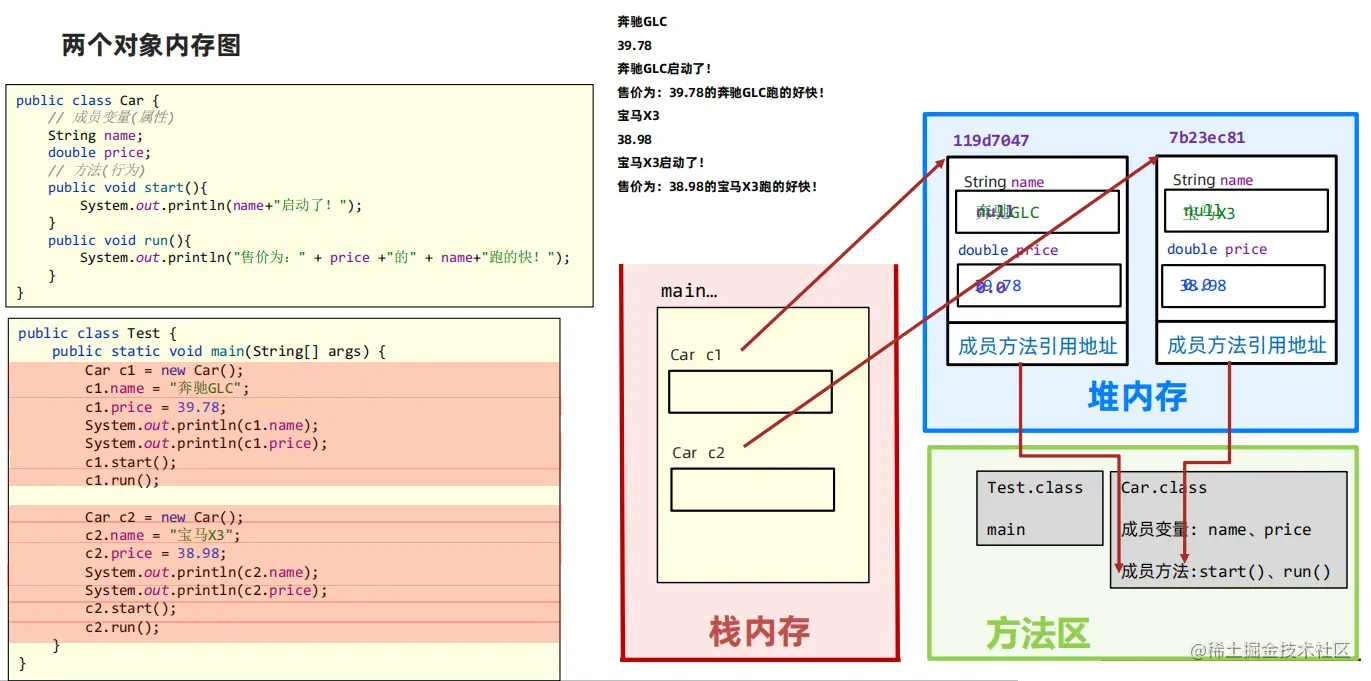 - 成员变量(name、price)的数据放在哪里,存在于哪个位置?