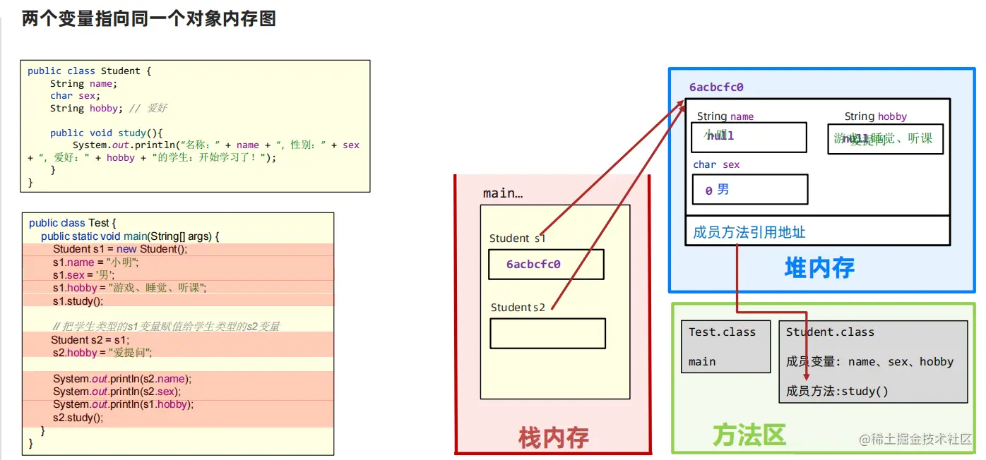 s2.hobby = "爱提问"; 改变了堆内存的值,导致:s1.study();和第一次输出的不一样
