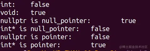 注意,上面的案例中,我们还检查了nullptr的类型std::nullptr_t是否是空指针,答案是true,但它并不是一个指针,因为在STL中nullptr_t实际上是一个类的定义,可以指向空指针,并不是一个指针类型,所以在判断它是否是指针时,会返回false。