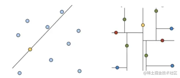 二叉树中,入参通过不断的判断左右子节点从而找到最终的尾节点方位,而KD树对于二叉树来说,它是多维的