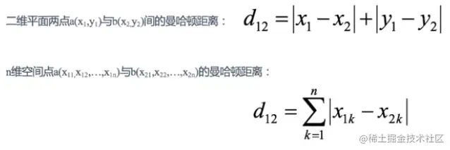 又名城市街区距离,由于有阻挡物,无法通过欧式距离进行两点间的最短距离,故而产生该距离算法得到最短街区距离