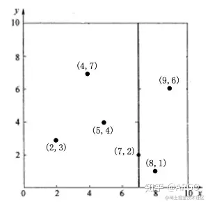 切分点的选择策略比较简单,是将带切分平面上的所有数据点按照切分域的维度进行大小排序,选择正中间的点作为切分点。如果正中间点是偶数个数,则任取中间左边或者右边的值作为切分点。