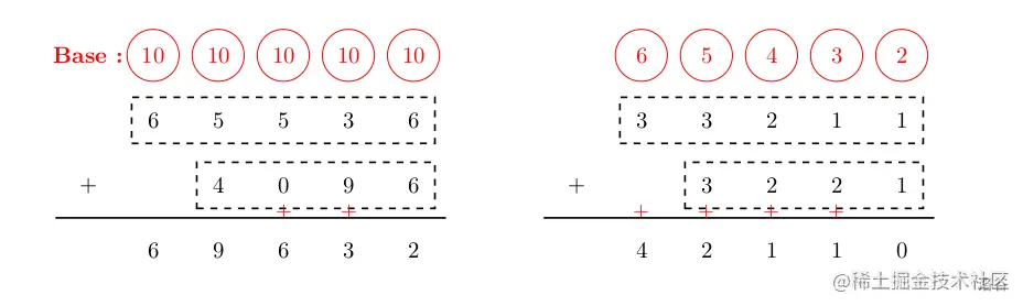 下图所示,左边是十进制的竖式加法;右边是这种特殊进制的竖式加法。图中的红色加号表示上一位发生了进位。