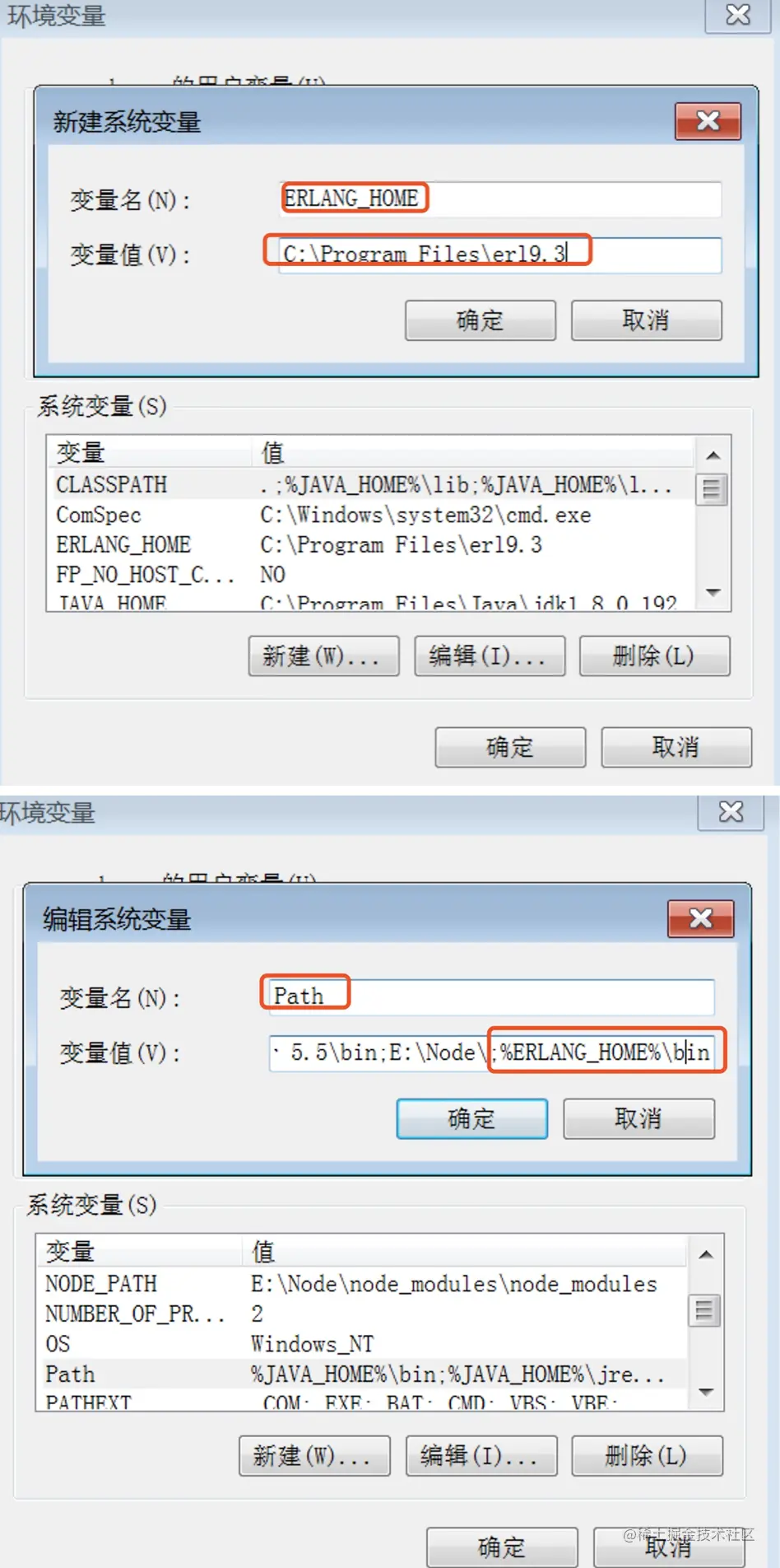 - 添加一个系统变量 ERLANG_HOME,设置为 Erlang 的安装目录,比如我的安装目录为: C:\Program Files\erl9.3 ;