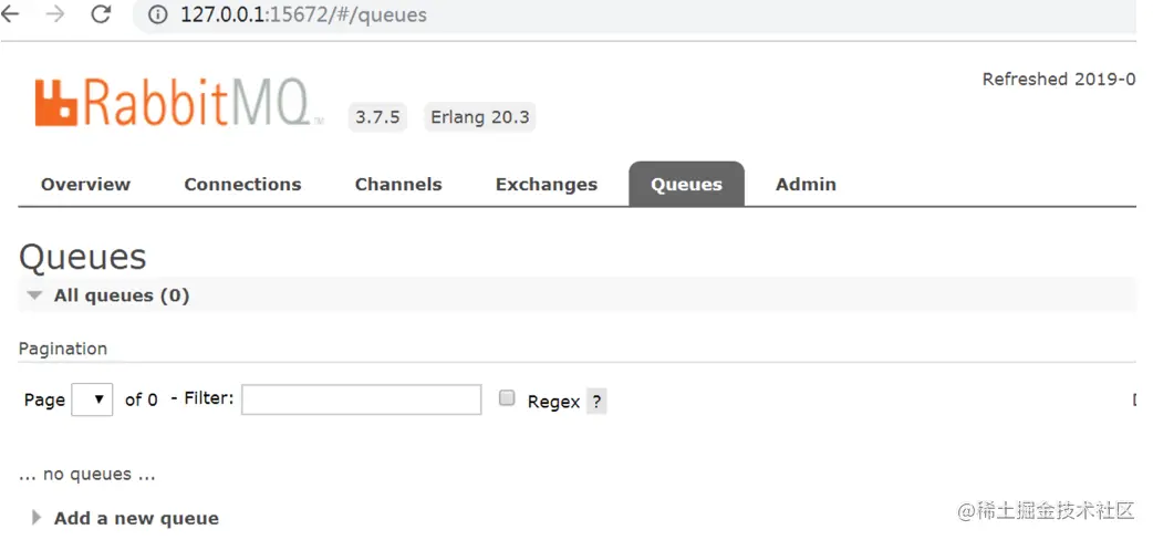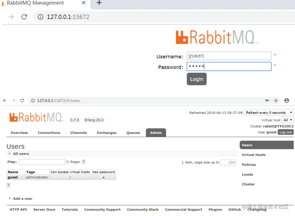 登陆RabbitMQ 的web管理后台,默认用户密码为 guest/guest