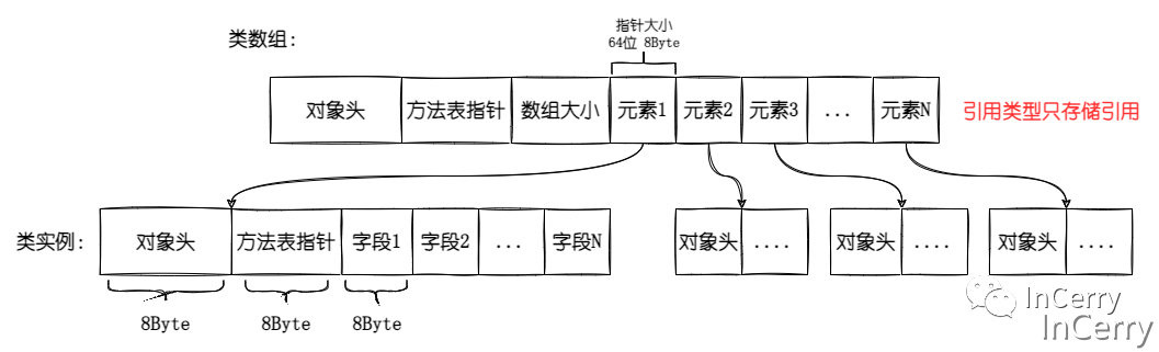 我们可以看到类数组只存放指向数组引用元素的指针,不直接存储数据,而且每个引用类型的实例都有以下这些东西。