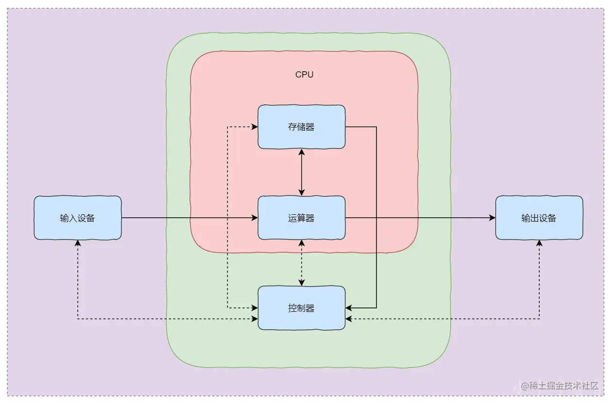 1946年,第一台计算机ENIAC诞生,人类进入计算机时代,冯诺依曼和其他计算机科学家们 提出了计算机"存储程序"的计算机设计理念,即将计算机指令进行编码后存储在计算机的存储器中,需要的时候可以顺序地执行程序代码,从而控制计算机运行。还定义计算机基本结构为 5 个部分,分别是运算器、控制器、存储器、输入设备、输出设备,这就是冯.诺依曼计算机。