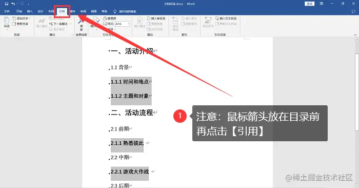 - 在Word页面的上方,点击【引用】,切换页面。 如下图: