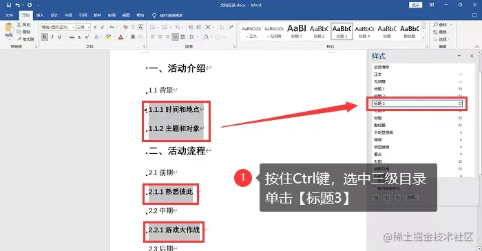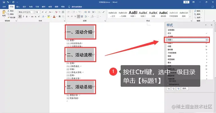 1、按住键盘的ctrl键,选中要设置的一级目录: 一、活动介绍;二、活动流程;三、活动总结。单击【标题1】,也可以在样式栏目的右下角点击,展开标题样式来选择。如下图: