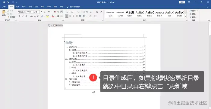 3、目录生成后,如果你想要调整目录内容,记得更改后,选中目录,鼠标右键单击【更新域】 ,就可以快速更新目录了。如果你只是想更新页码,就在【更新目录】窗口单击【只更新页码】即可。 如下图: