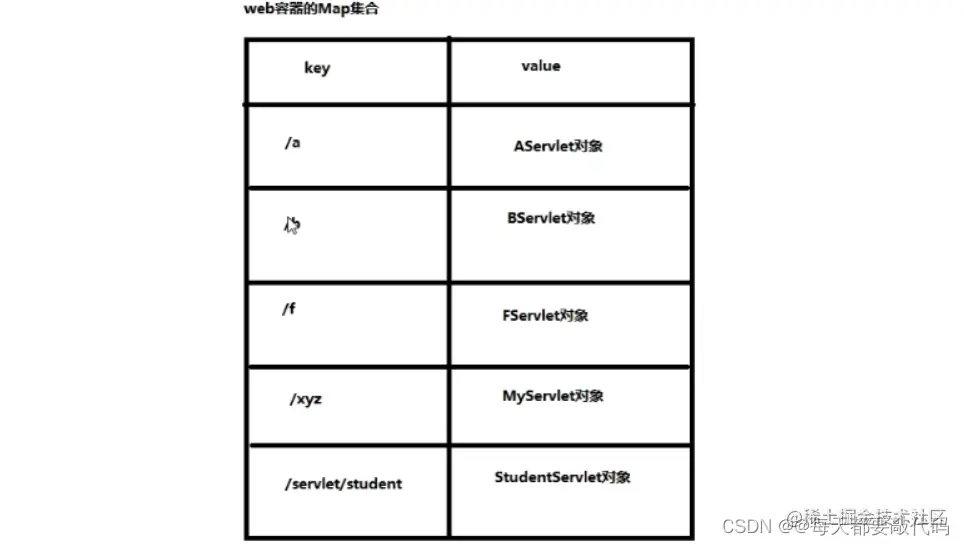 - web容器底层应该有一个HashMap这样的集合,在这个集合当中存储了Servlet对象和请求路径之间的关系: