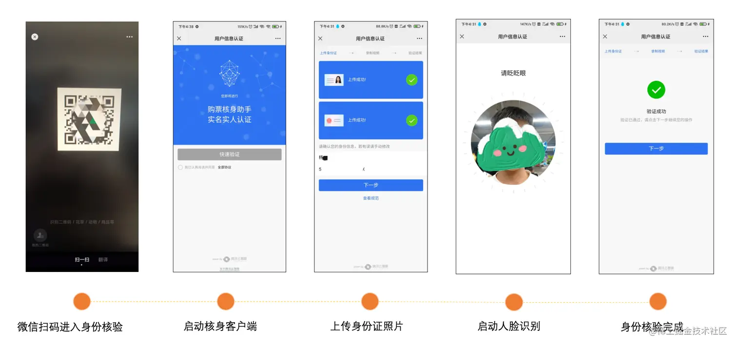 2.游客使用微信扫描二维码后跳转到核身Url指定的核身H5页面,进行身份证OCR识别以及人脸识别身份核验 ,核身完成后自动调用RedirectUrl指定的获取核验结果的接入方后端接口
