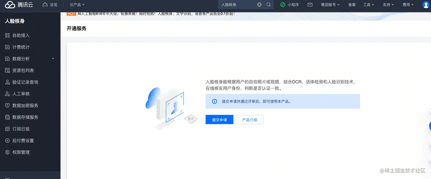 我们先进入腾讯云慧眼 人脸核身控制台 ,首次使用人脸核身服务的用户,需要先开通人脸核身服务。直接点击提交申请,按照实际情况填写信息,提交申请。