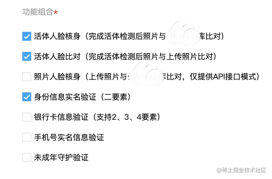 因为腾讯云微信浮层H5服务不仅支持权威库比对,还支持客户自传身份证照片,所以需要的功能组合为:活体人脸核身(完成活体检测后照片与权威库比对)、活体人脸对比(完成活体检测后照片与上传照片比对)和身份信息实名验证(二要素)。