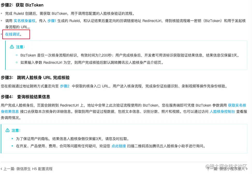 在仔细阅读官网文档后,借助在线API调试工具,可以直接复制核心调用逻辑,相当顺畅地接入到逻辑代码中,整个demo实现下来,体验很好。同时,经过多次测试,都能够准确无误识别,准确率很高,再加上官网文档中所提到的一系列安全方案,可以说腾讯云微信浮层H5人脸核身能够达到景区门票购票时人脸核身的要求。