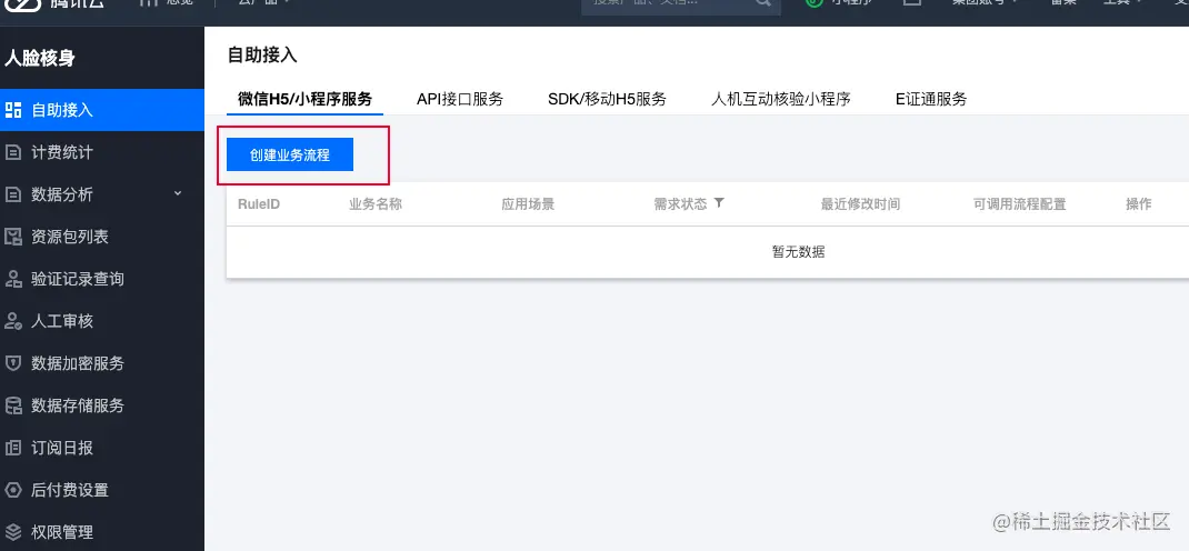 成功开通人脸核身服务后,进入自助接入页面。,在这里点击创建业务流程就能够为业务创建一个使用场景。