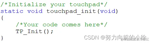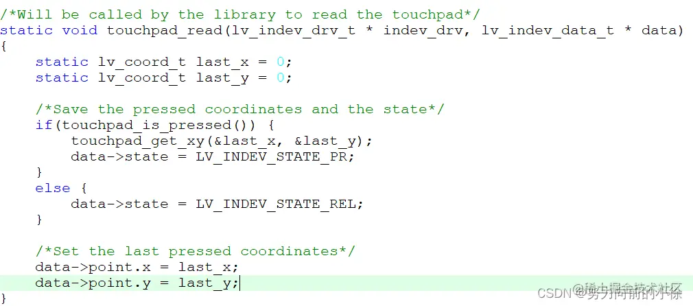 我们可以直接在这里面实现触摸按下检测和坐标读取,也可以单独去实现touchpad_is_pressed函数(检测触摸是否按下)touchpad_get_xy函数(获取当前点击的坐标值),最终达到实现该函数的目的。下面的原子的实现方式,直接在touchpad_read函数中去实现了。
